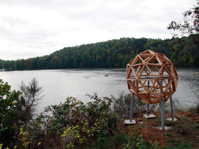 42 ECK - gespaltene Eiche - 120 teilig - 42 Ecken - 80 Dreiecke - 150 cm Durchmesser Jahr: 2006 Projektpartner: "6. Kunst am Wasser" zum Talsperrenfest Kriebstein Aufgestellt an der Talsperre Kriebstein.